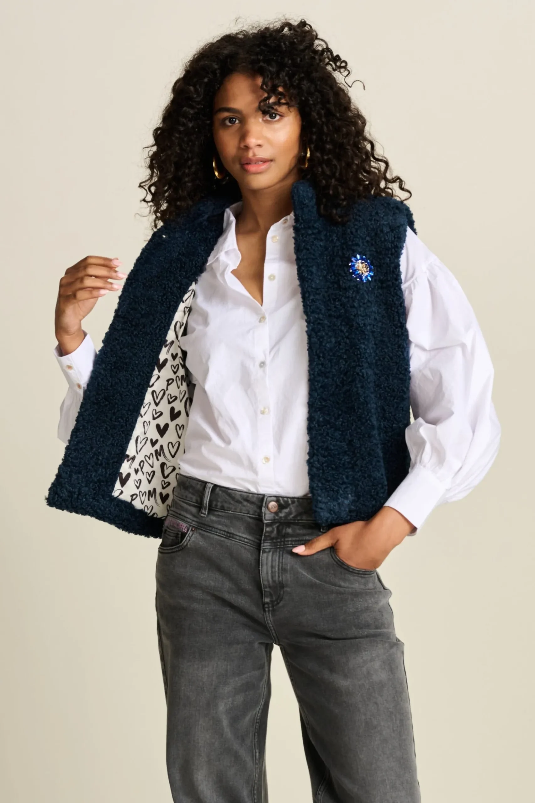 Het gilet heeft een rechtvallend model en komt tot de heup. Het model op de foto is 175 cm en draagt maat 36.