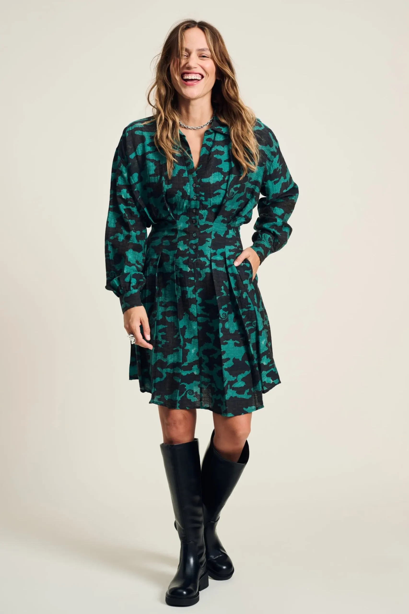 Pasvorm: De jurk sluit aan in de taille en loopt aan de onderkant wijd uit. Het model op de foto is 170 cm lang en draagt maat 36.