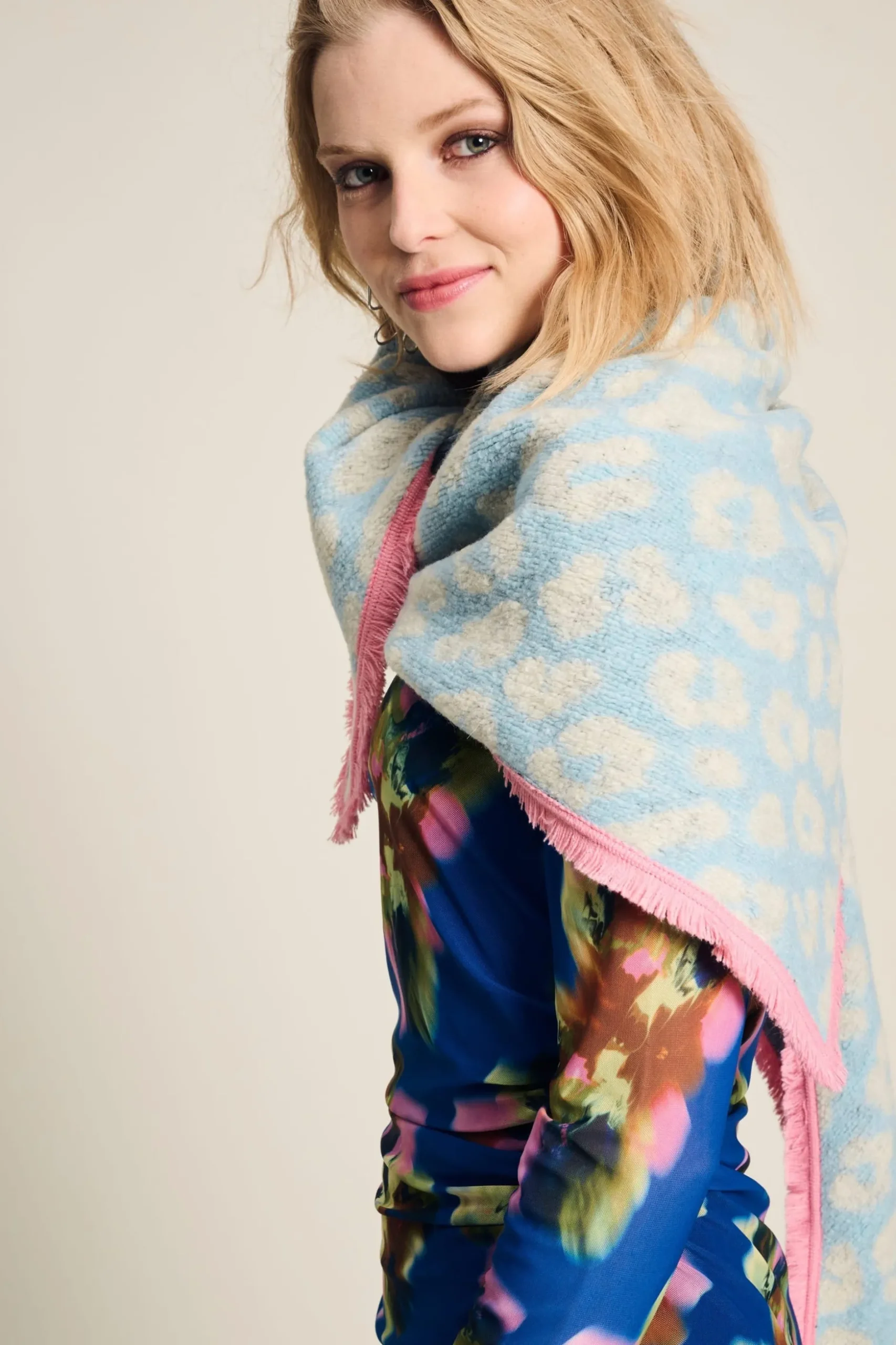 Deze blauwe sjaal heeft een ecru panterprint. De sjaal is afgewerkt met een roze bies.