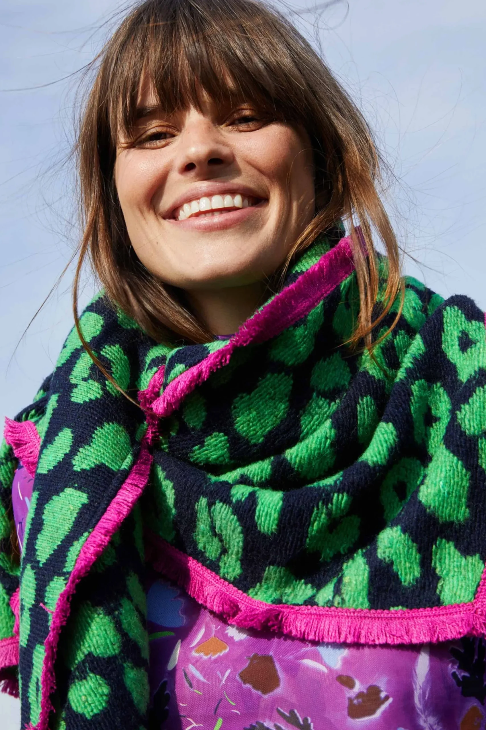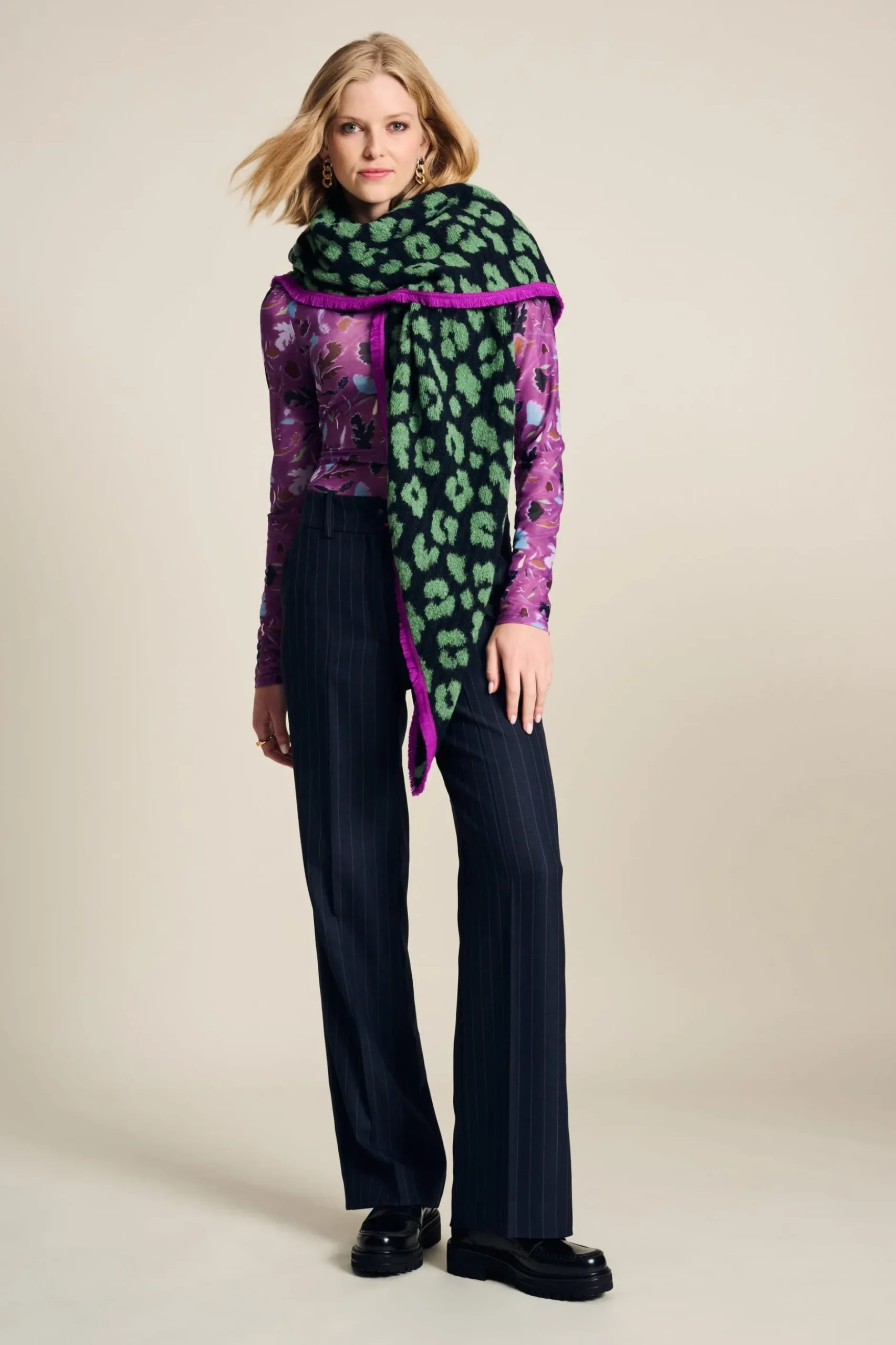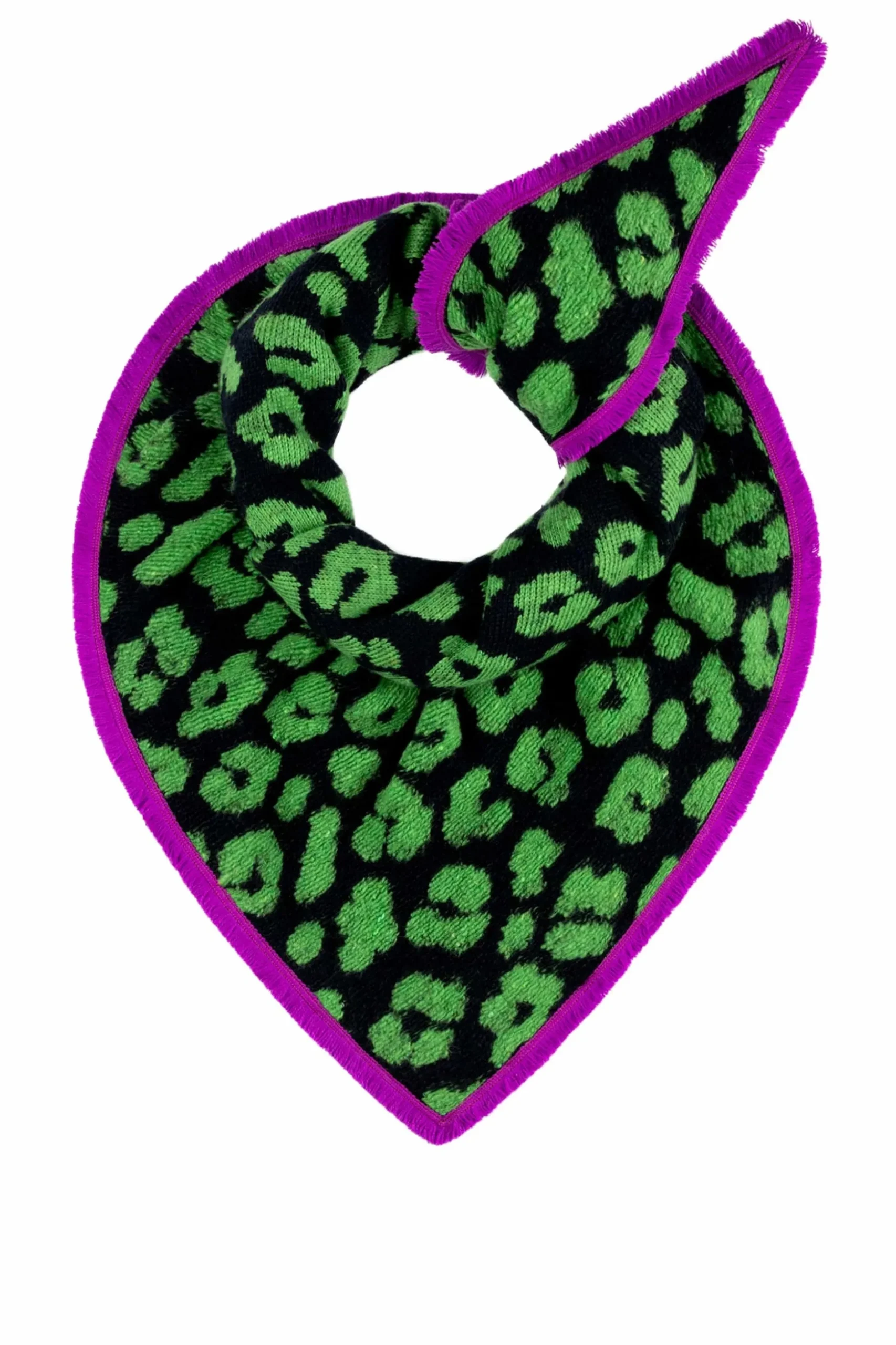 Deze groene sjaal heeft een panterprint over de hele sjaal. De sjaal is afgewerkt met een roze franje bies.