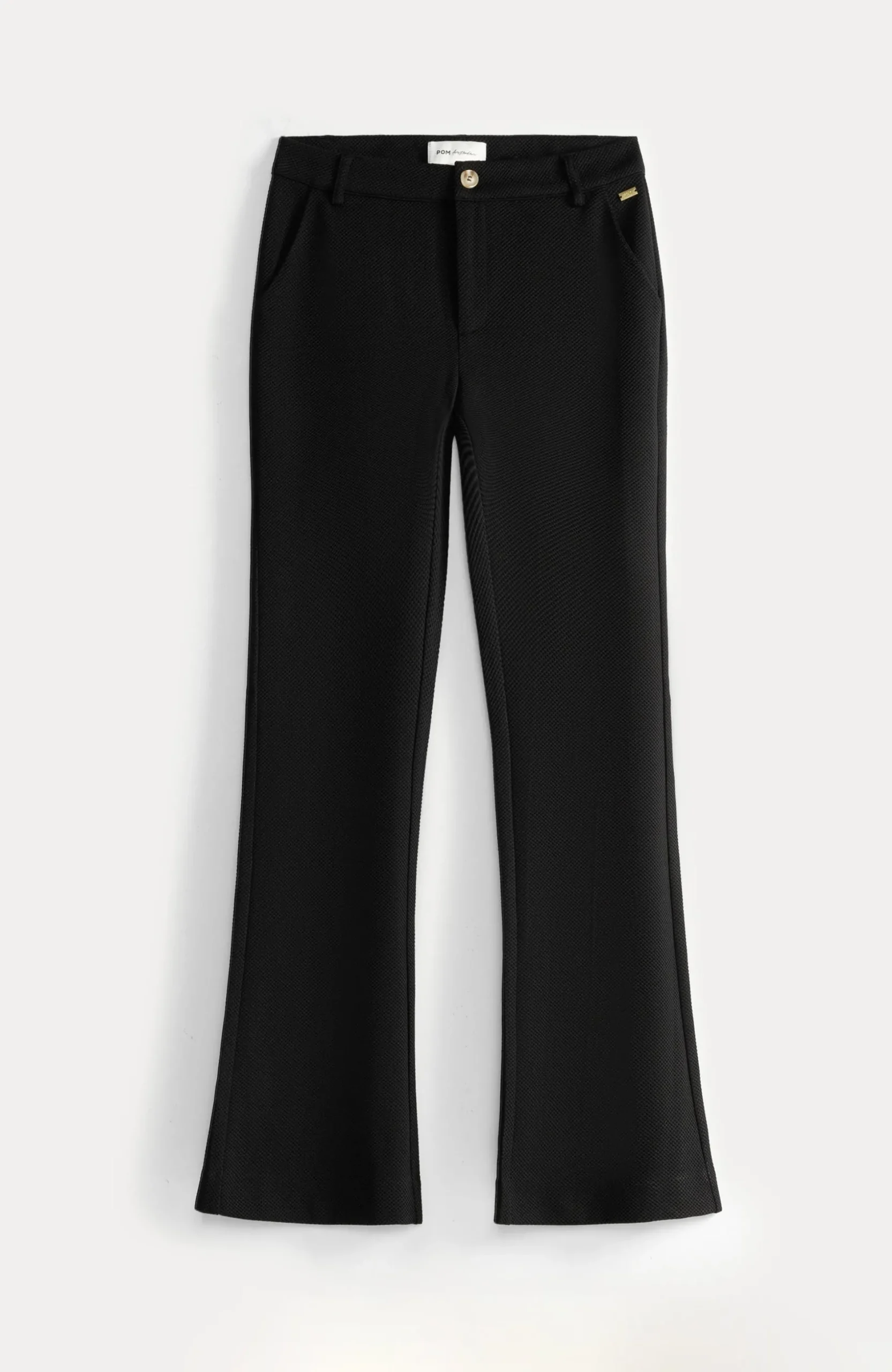 De broek is aansluitend aan de bovenkant en heeft flared pijpen. De broek heeft een binnenbeenlengte van 81 cm. Het model op de foto is 175 cm en draagt maat 36.