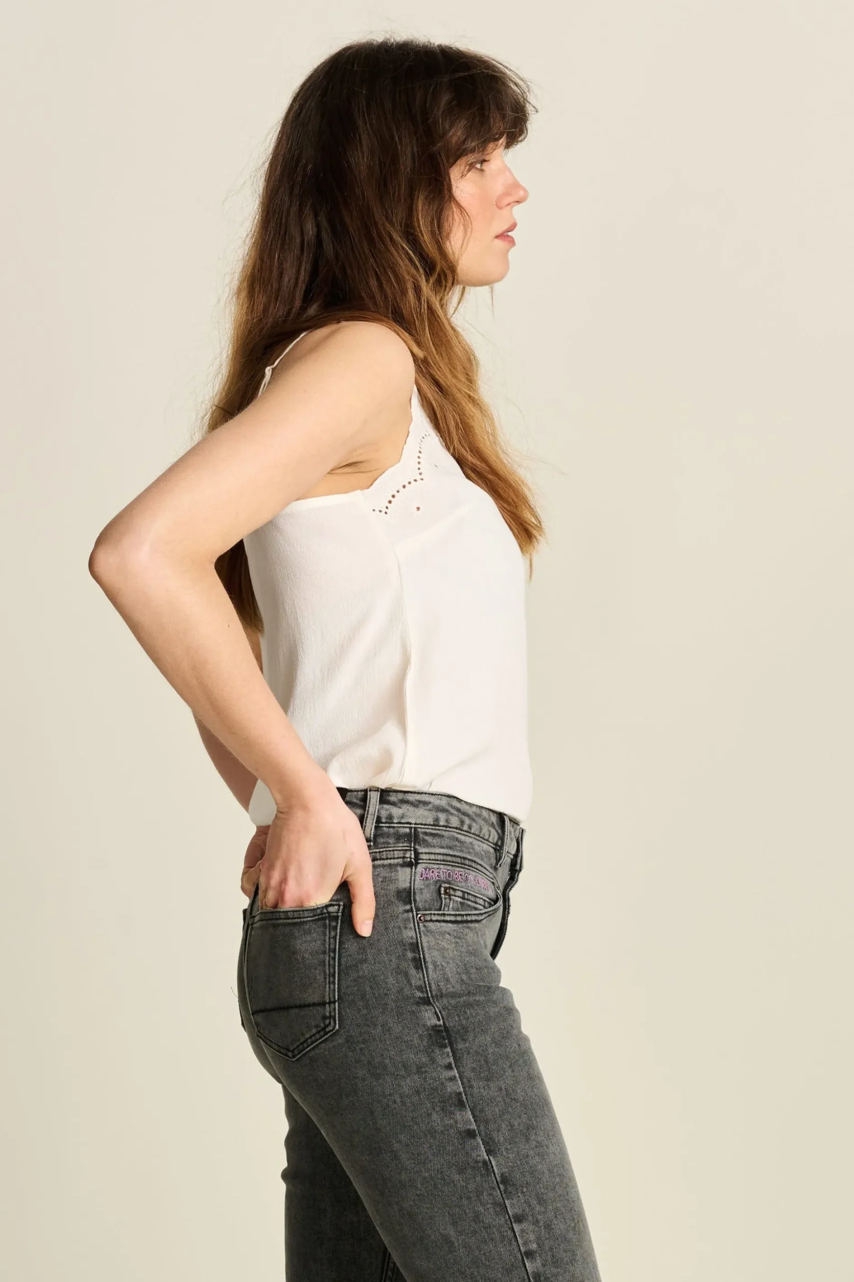 Het model in de fotois 179 cm lang en draagt een maat 36.